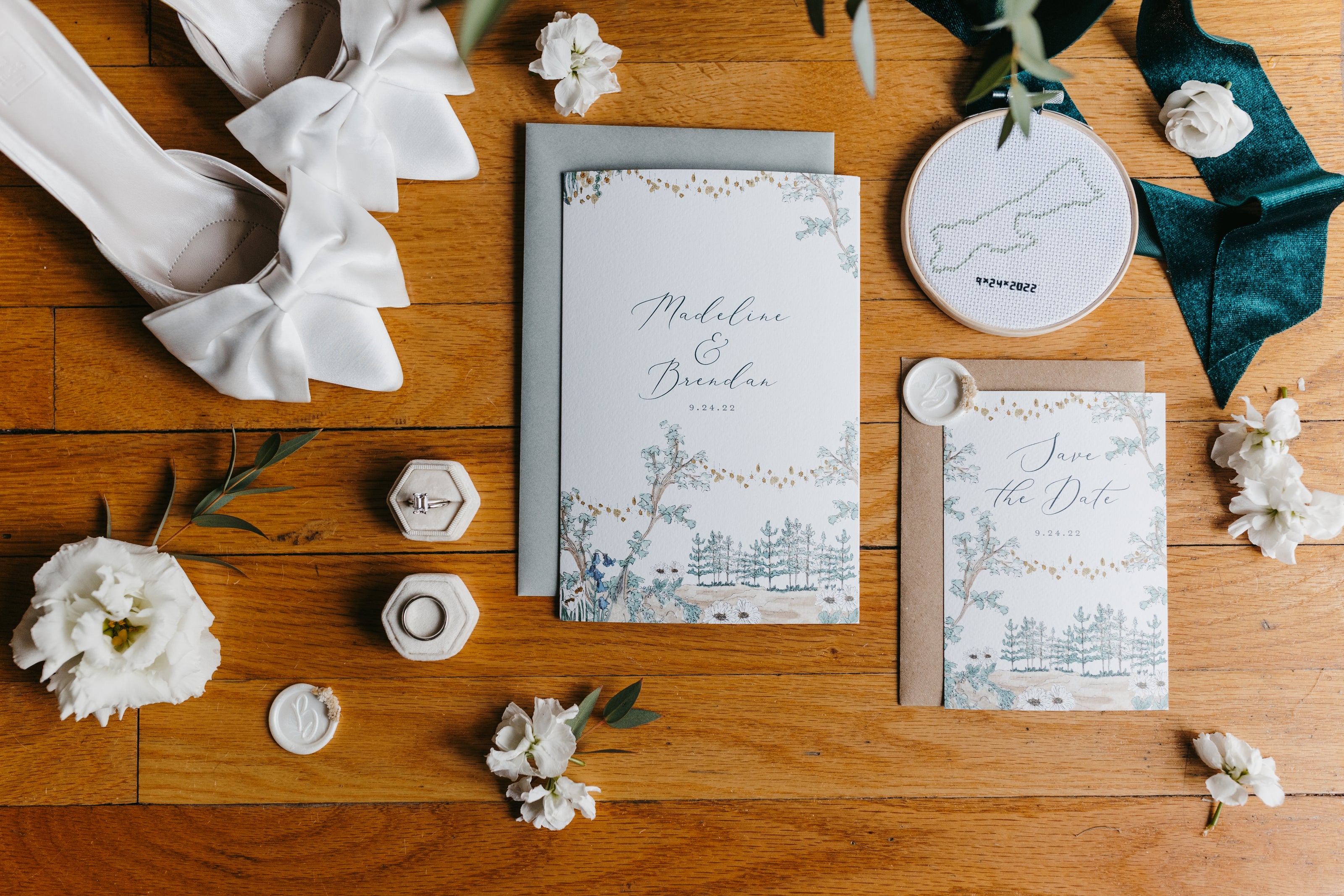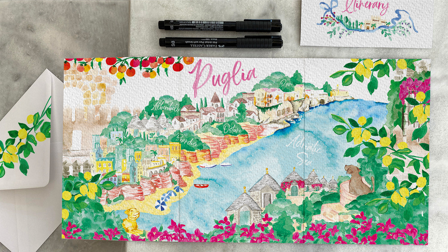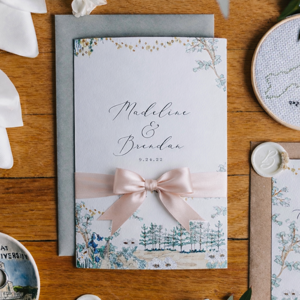 Every piece is hand-drawn and crafted with meticulous attention to detail, from multi-panel invitations and scenic illustrations to menus, place cards, and on-the-day signage.
