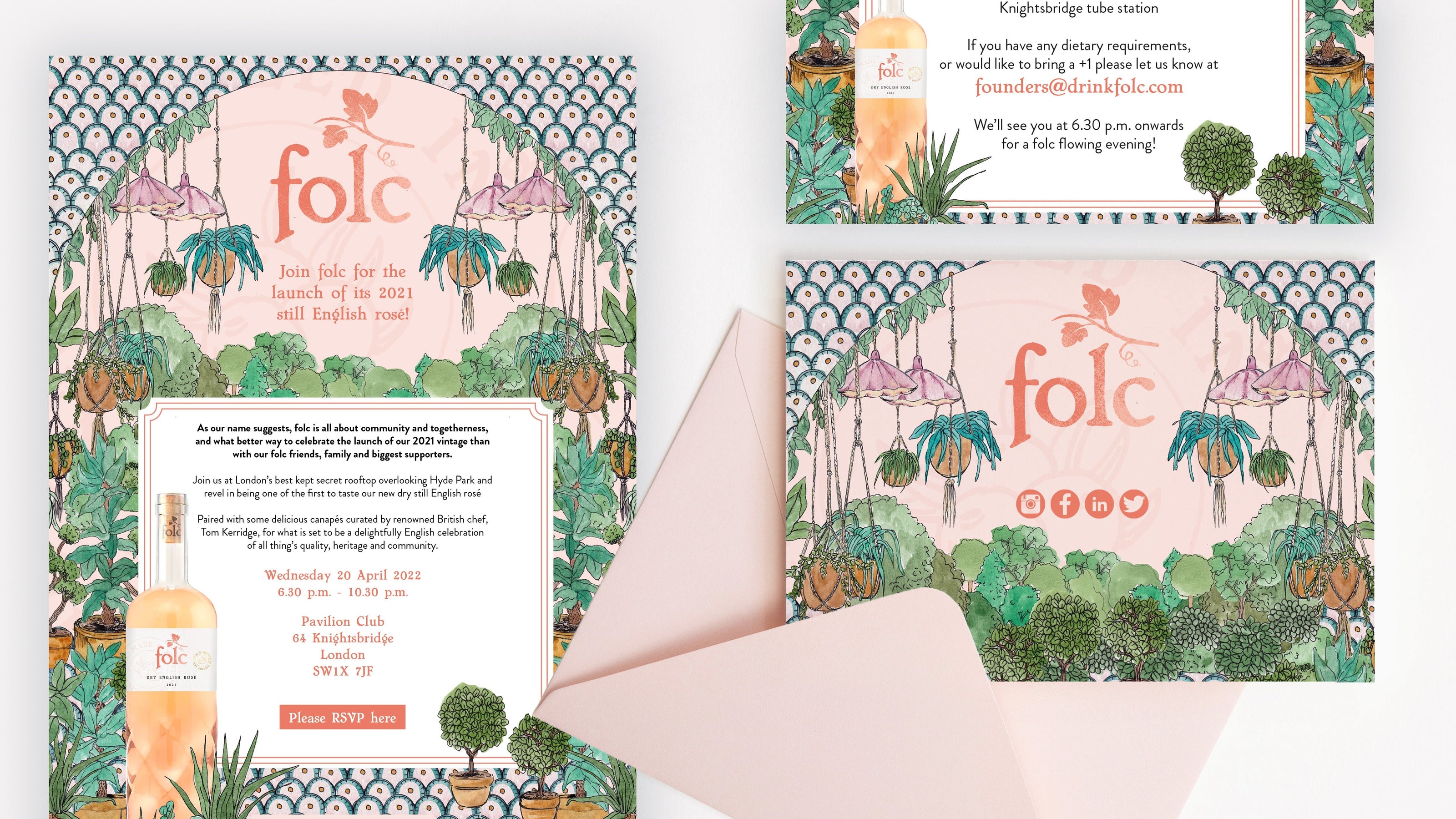Beautiful stationery for exclusive events. Folc Rose requested an 'outdoors-in' vibe to celebrate the launch of their new wine at the prestigious London venue The Pavilion.