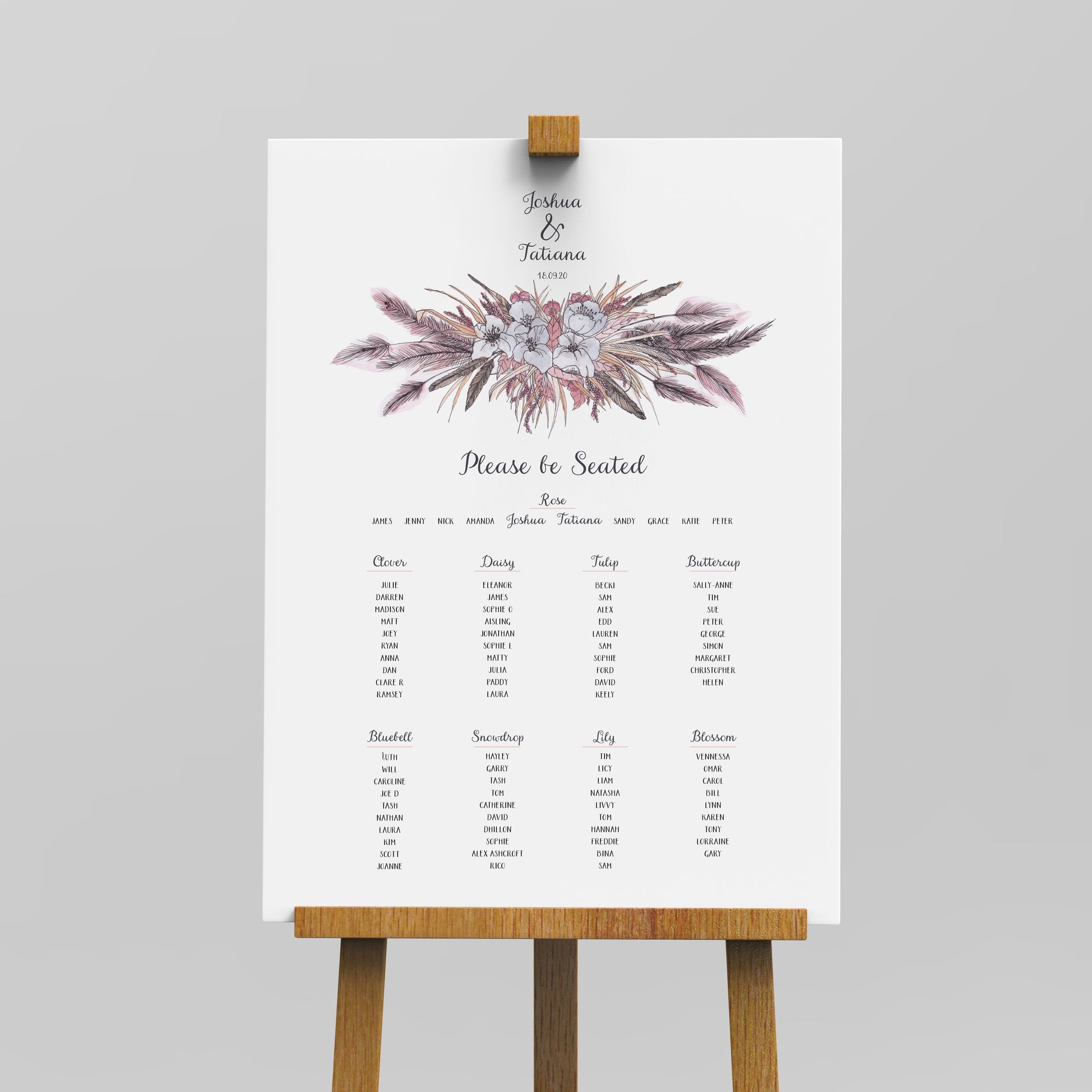 Choose from the in-house collection of original artwork to match your wedding stationery set or simply compliment your existing decor. Pampas grass clouds and wild flower arrangements frame the text in this table plan. Hand illustrated and subtly coloured with pastel palette, this wedding design nods towards vintage style with its illustrations paired with a relaxed informal font. This table plan can be fully customised with your details. All you need to do is send a list of tables and guest names. When you place your order you will receive and email requesting the information and optional colour preference. You'll then receive a proof by email and amends will be made prior to print. This process typically takes 2-3 weeks.