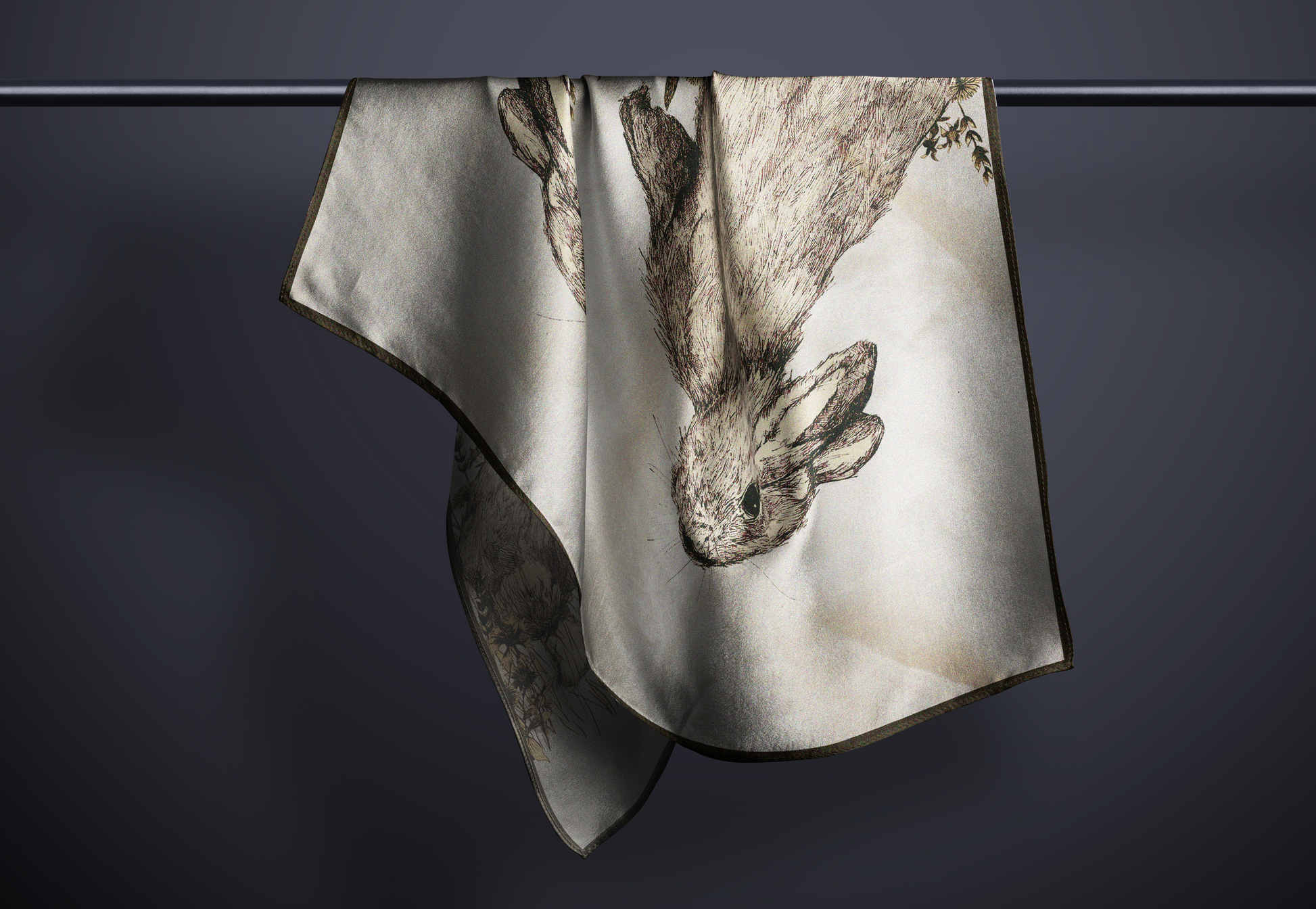 A stunning hand painted scarf design featuring a pair of bunnies in a conversational print. The colours are natural and the illustrative lines give an abstract print when draped.