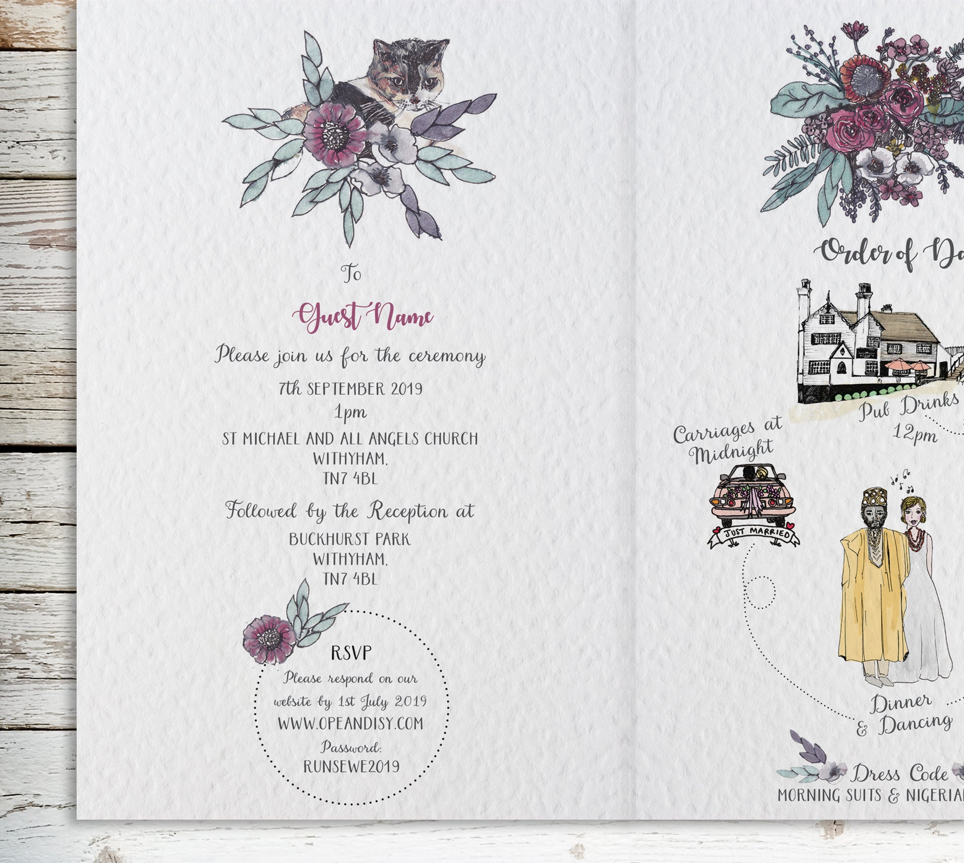 The format is a roll folded invitation that when opened, reveals plenty of room for your wedding day information. There is space for a hand drawn map, order of day and additional illustrations.