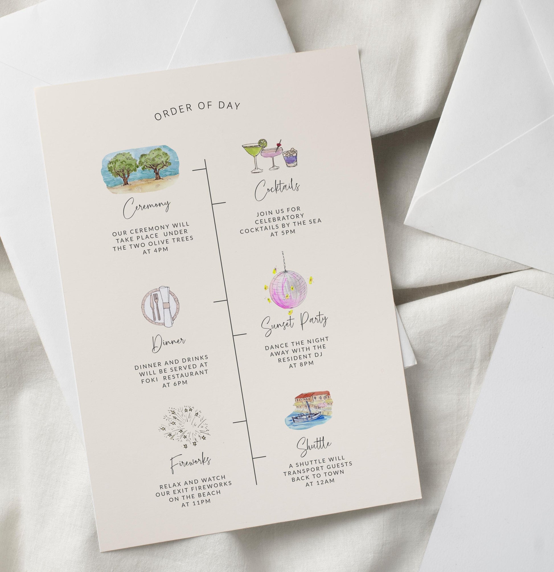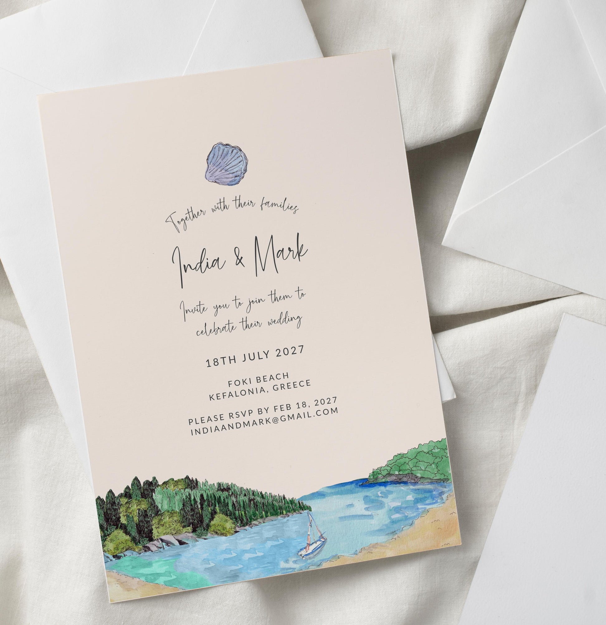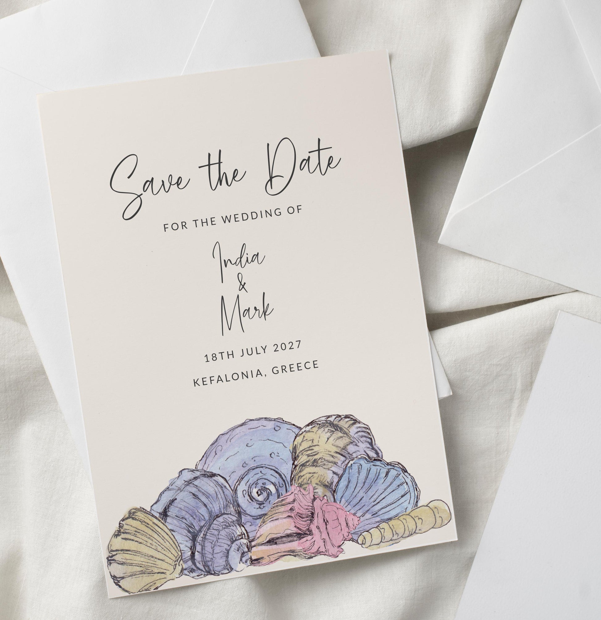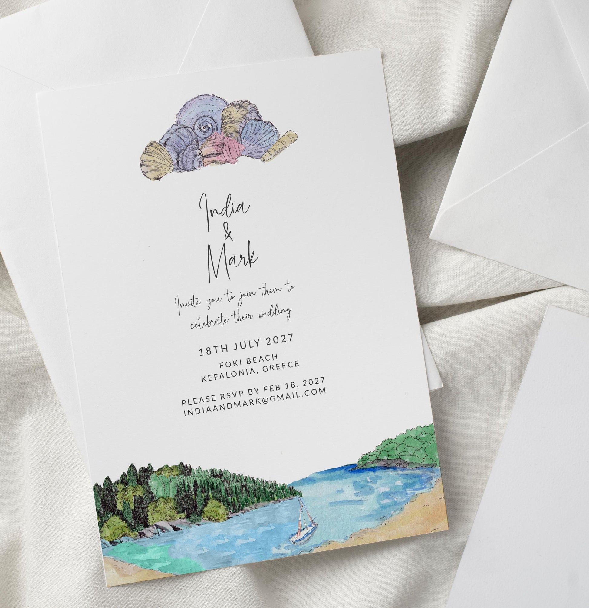 Sea Shells Greek Beach Themed Wedding Invitation with 8 TEMPLATES, Optional Customisation & Print, Wedding Invite, Pastel Coastal Scene Printable Elegant EDITABLE Download
