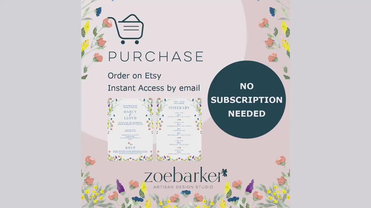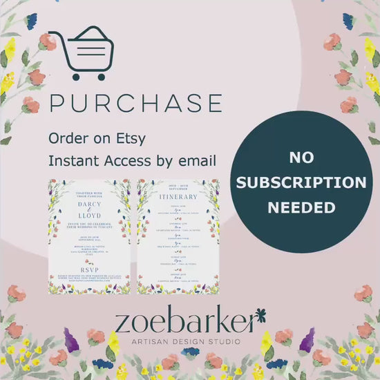 Instant access to an easy to edit wedding invitation template with additional stationery items. The perfect way to introduce our unique hand painted designs to your wedding.