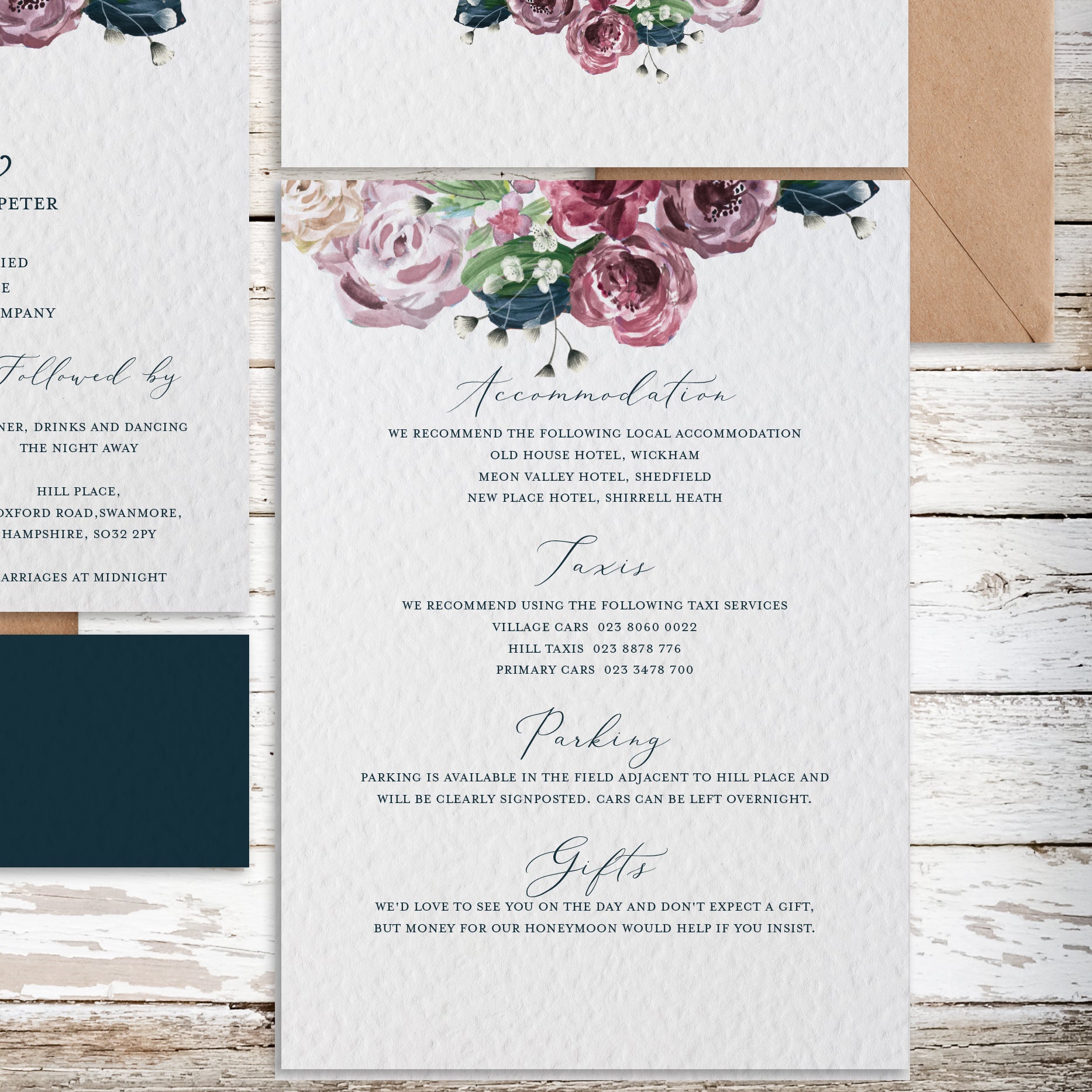This vintage bouquet design can be fully customised with your details. It features hand painted flowers with intricate illustrated details in a jewell colour palette including emerald greens, deep violets, deep maroons and pops of blue. When you place your order you will receive and email requesting the information and optional colour preference. You'll then receive a proof by email and amends will be made prior to print. This process typically takes 2-3 weeks.