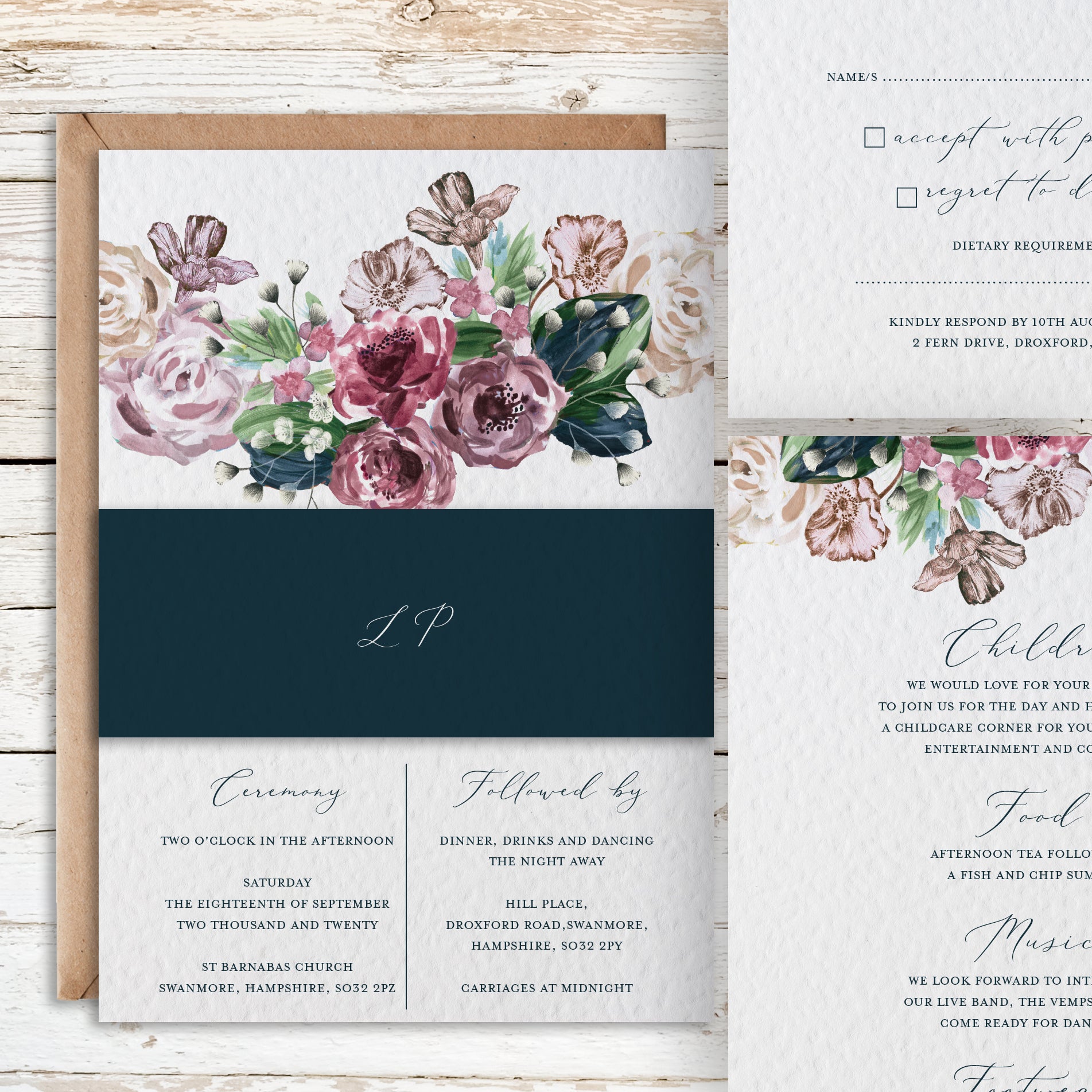 These gorgeous designs are printed on to luxury uncoated 350gsm card stock. Your invitation information will be printed on 1 side with a plain soft grey lilac coloured back. The information card can house the accommodation and travel details. Your RSVP card will advise guests on when and how to respond. The belly band is a thin strip of card that wraps beautifully around your wedding invitation stack to secure all items and add the wow factor. Your guests will love your bobo styled wedding stationery.